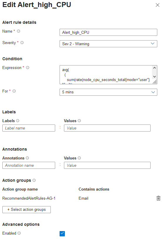 One of the perks of using the managed Prometheus instance is the ability to instantly integrate it with Azure monitor. This option makes it easy to create alert rules for various metrics.