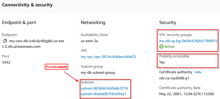 As mentioned earlier, the RDS instance databases must reside within a private subnet as best practice. Therefore as a result no access is allowed from the outside world. However, we can add a temporary route only for the duration of the DB restore process.